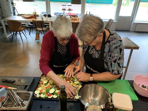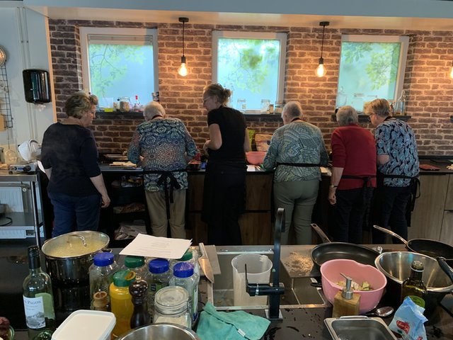 De locatie bevindt zich op huisnummer 23b. B van bevallig en bijzonder. Een apart pand in Eibergen is volledig ingericht als kookstudio. Het houdt het midden tussen een chic restaurant en een ontmoetingsruimte want er is maar één grote tafel. Een achttal dames en één heer zijn allemaal ergens in de ruime open keuken bezig. Er worden spekjes gebakken en soep gemixt.