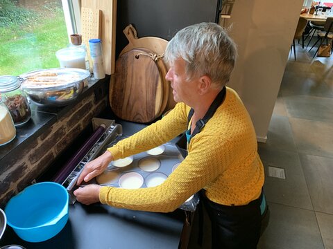 Op het aanrecht een keurig A4-tje met een uitgeprint recept van kippestoofpotje. De dames die de kip aan het bakken zijn, verklappen me dat er een cheesecake in de oven staat. Dit wordt een vier-gangen menu, begin ik te begrijpen.